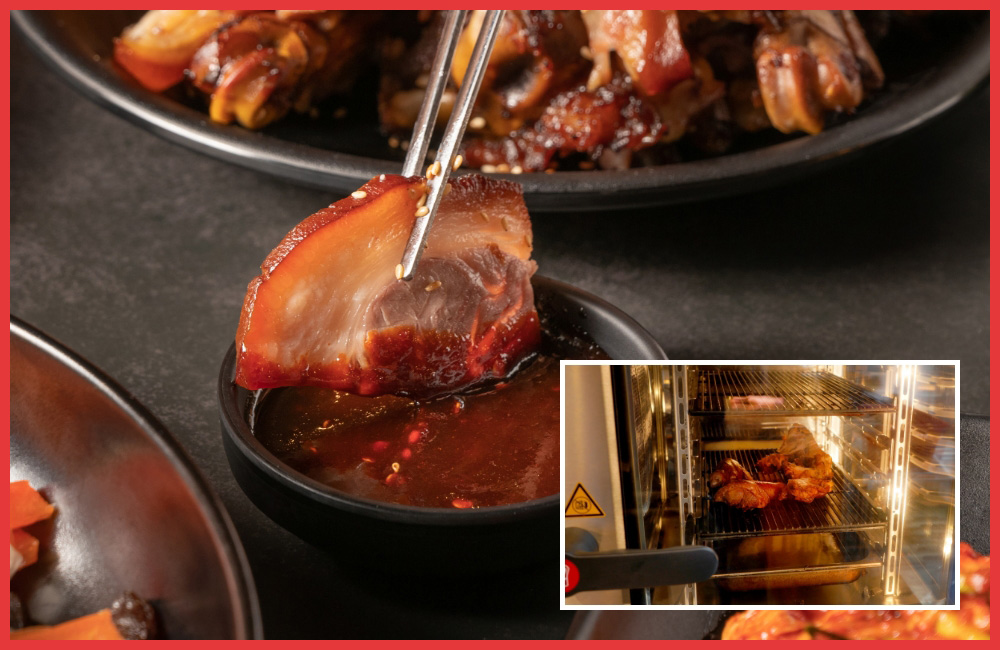 자체 특허 훈연기를 사용하여 고기의 잡내를 제거하고